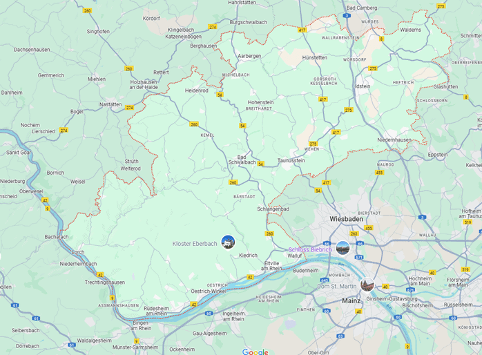 A bit late, I’ll admit, considering I lived in Frankfurt for 3 years and never once thought to explore places like Rheingau, Pfalz, Rheinhessen, etc 🙈. But hey, it’s never too late, right? Just 25 minutes west of Frankfurt, one of Germany’s 13 wine regions starts showing off its treasures: Rheingau (roughly “Rhine district”, the “gau” suffix giving away its old ties to the Frankish Empire). We pull up the map again to get a clearer picture of the topography, because here too, the terrain leaves a serious mark on the wines. This is where the Rhine takes a sharp turn, probably blocked by the “Taunus mountain”* and switches its course from east to west.