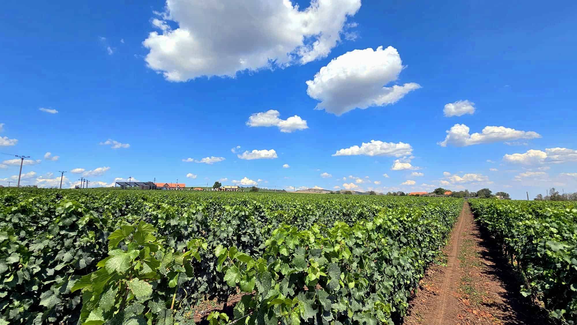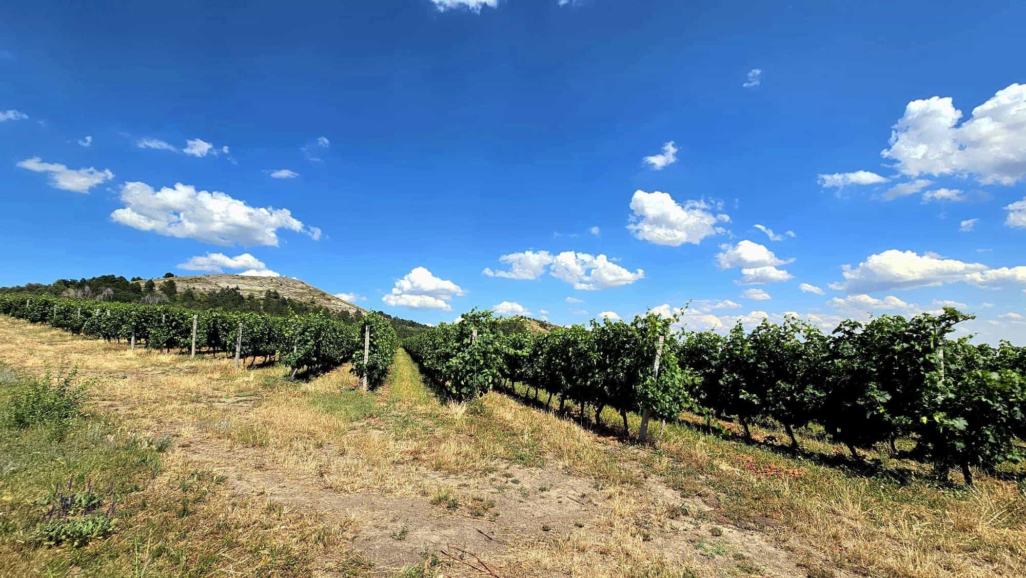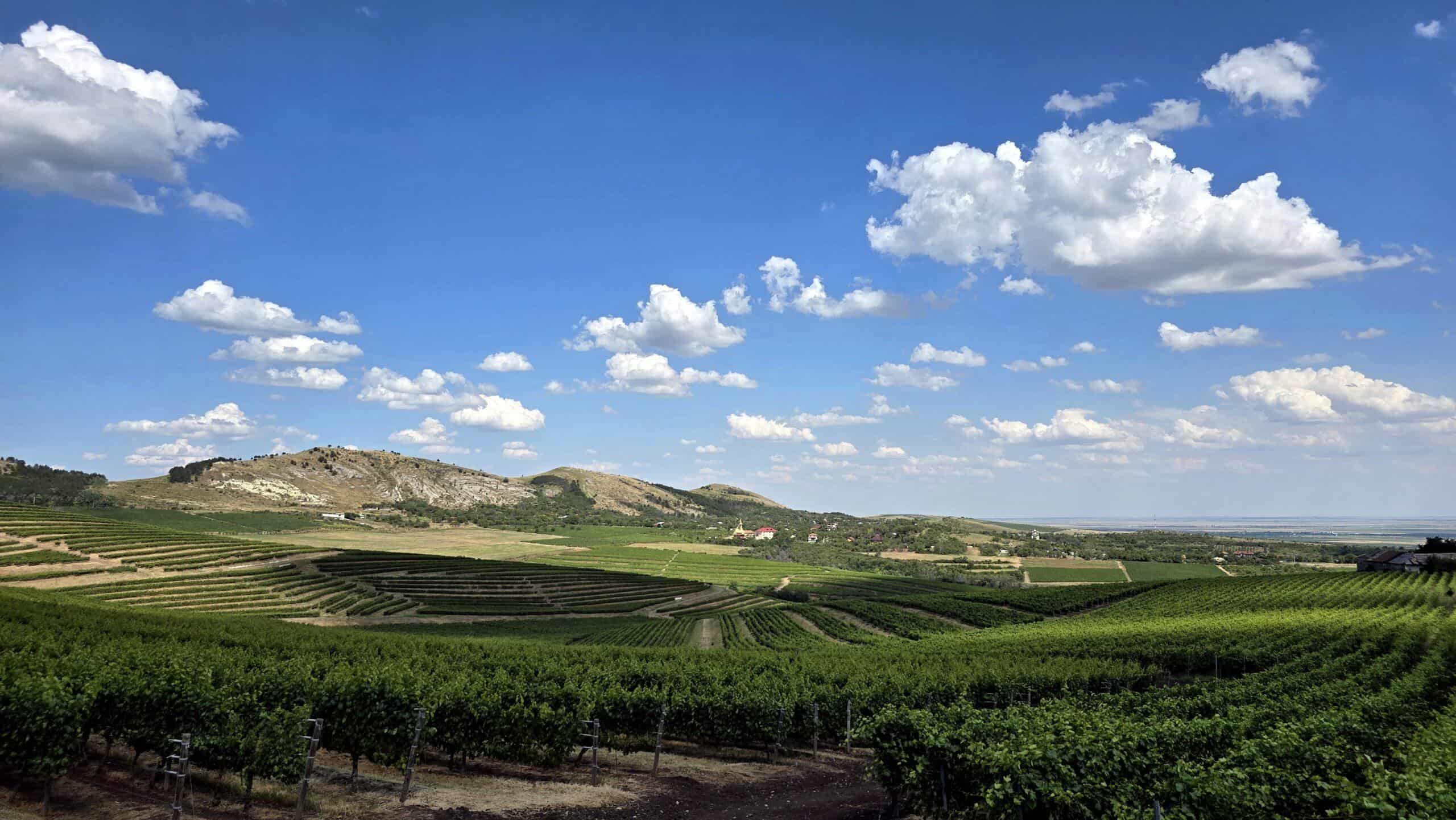 Dealu Mare on the Romanian Wine Road, July 2025 Vine și peisaj rural sub cer senin, cu câmpuri și livezi în fundal.